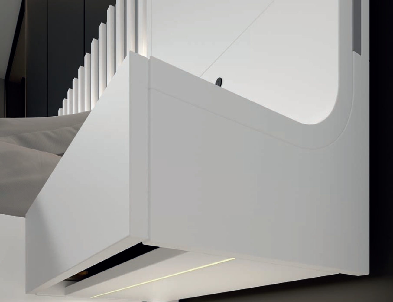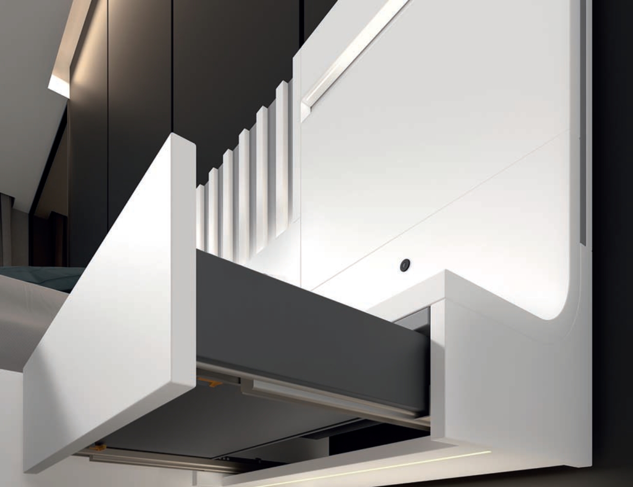 Por otro lado, el dormitorio cuenta con soluciones prácticas que optimizan el orden sin comprometer la estética. Gracias al sistema de apertura con tirador push, se consigue un acceso fluido y sin elementos visibles, lo que refuerza la limpieza visual del conjunto y mejora la funcionalidad diaria. Asimismo, las guías de extracción total con gatillos permiten abrir cajones por completo, ofreciendo mayor comodidad, capacidad y aprovechamiento del espacio. Así, cada componente está pensado para simplificar la rutina, mantener el entorno despejado y adaptarse a las necesidades de cada usuario. Por tanto, este conjunto no solo decora, sino que también responde a las exigencias del día a día con elegancia, eficiencia y sentido práctico.