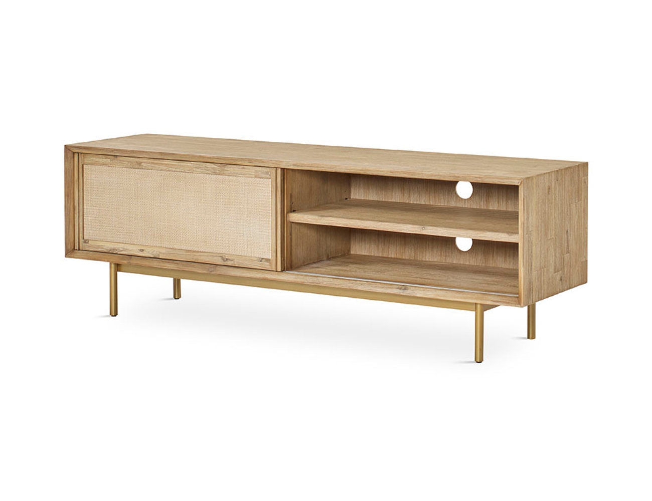 Este mueble de TV no solo es una pieza decorativa, sino también extremadamente práctico. La madera maciza de acacia aporta una textura natural y elegante, mientras que las patas doradas refuerzan su aspecto sofisticado. Además, su diseño, cuidadosamente estructurado, aprovecha al máximo el espacio disponible, ofreciendo almacenamiento eficiente sin sacrificar la estética. Su robustez asegura una larga vida útil, resistiendo el uso continuo sin perder calidad ni atractivo. Así, este mueble se adapta a cualquier estilo decorativo, transformando tu salón con elegancia, funcionalidad y durabilidad, siendo perfecto para quienes buscan un equilibrio entre diseño y practicidad.