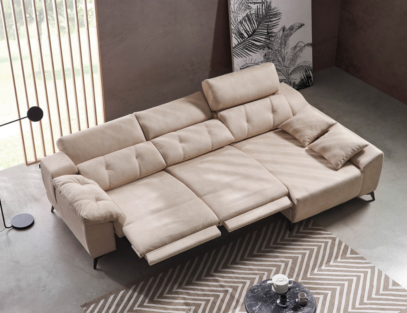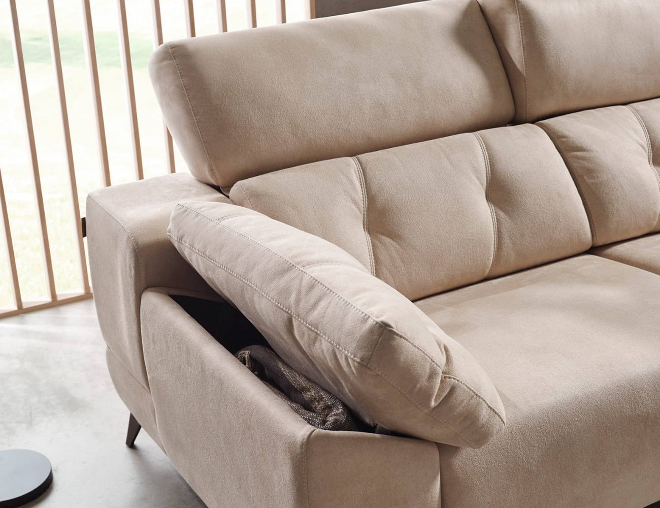 Asimismo, los brazos rellenos de fibra hueca conjugada y siliconada brindan suavidad y confort adicional; además, las almohadas desenfundables con sistema rolen facilitan la limpieza y el mantenimiento. Igualmente, el módulo chaiselongue deslizante eléctrico con arcón proporciona espacio extra y practicidad, mientras que las botoneras y la opción USB en módulos clave completan un diseño moderno y versátil.