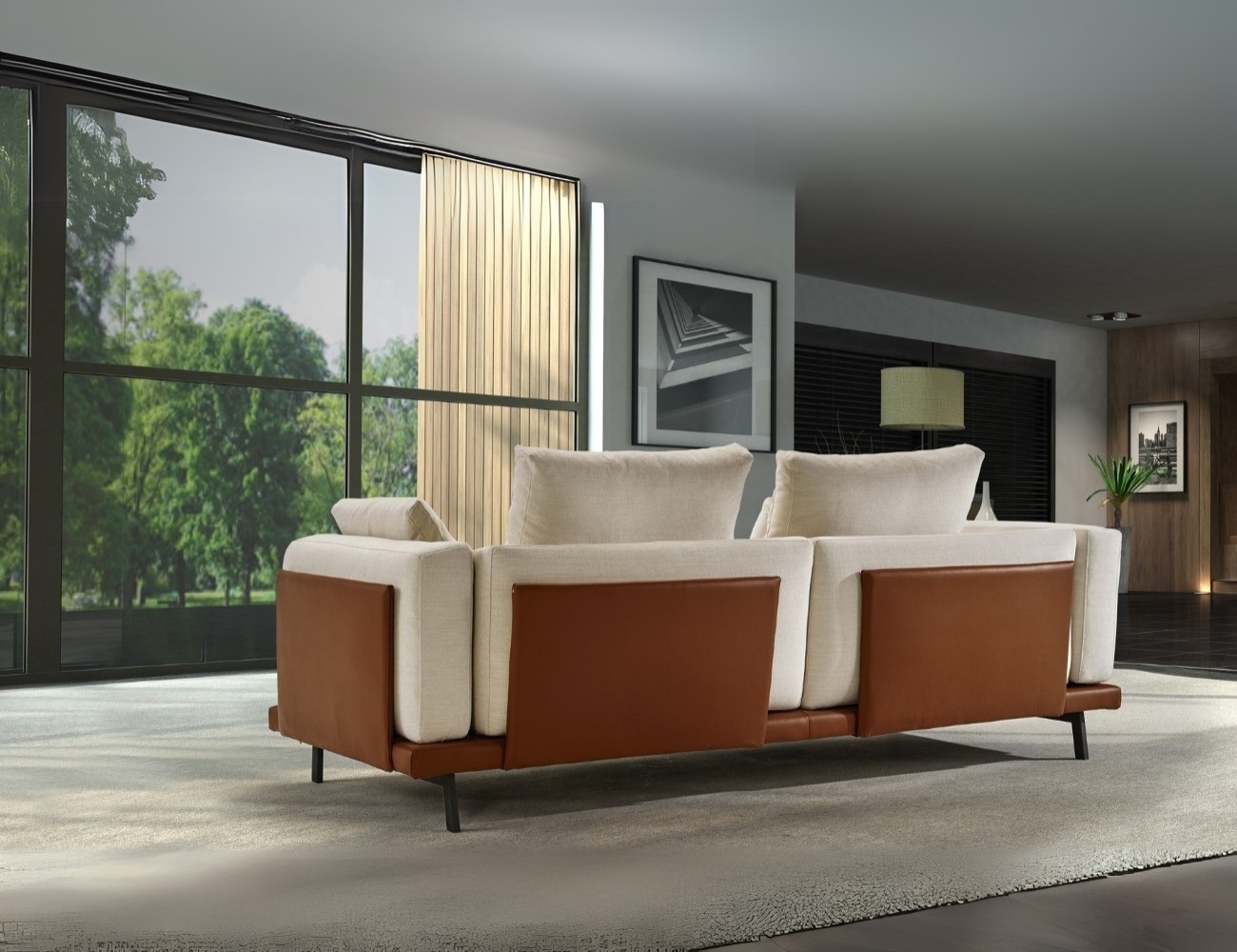 Construido sobre un armazón de madera de pino y tablero de partículas, este sofá ofrece una estructura firme que se adapta sin dificultad al uso cotidiano. A su vez, las almohadas de asiento con espuma HR certificada proporcionan un soporte consistente que mantiene su comodidad a lo largo del tiempo. De igual manera, los respaldos con fibra siliconada hueca aseguran una sensación suave y un apoyo constante sin perder forma.